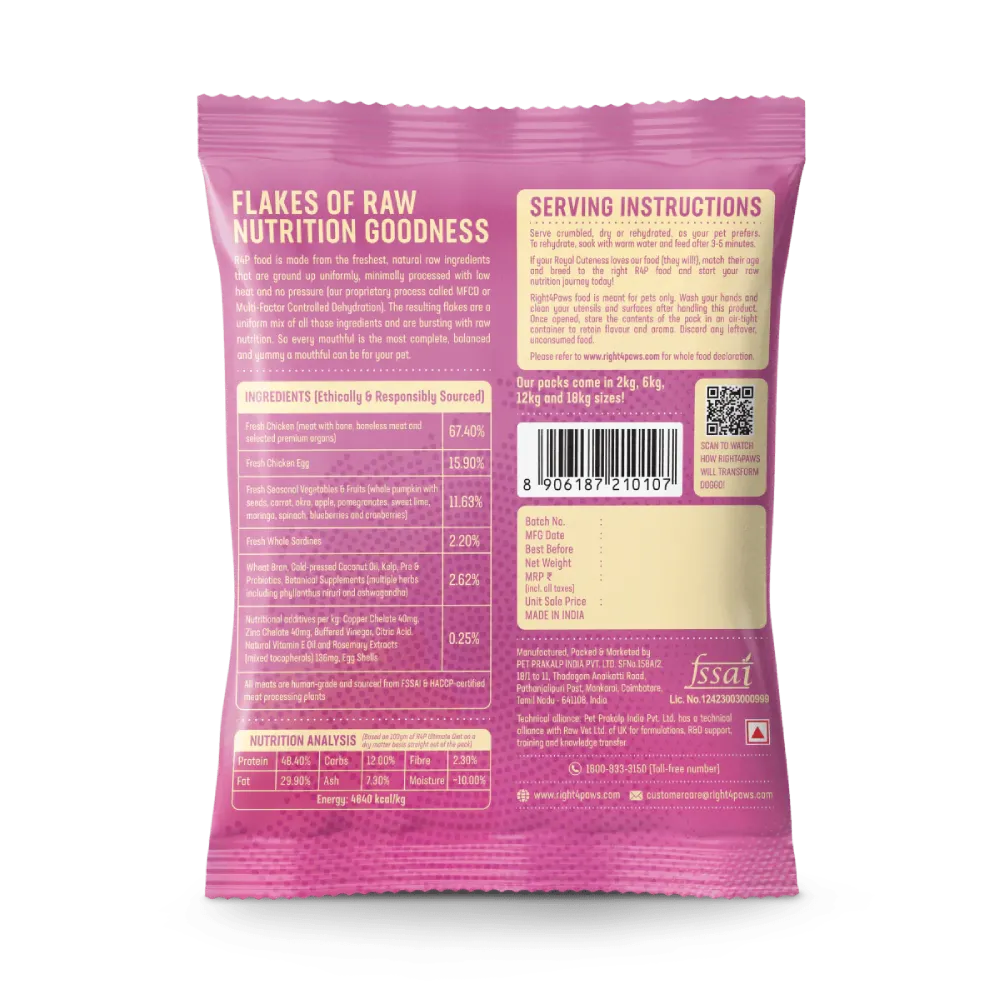 The meats are human consumption grade and from FSSAI and HACCP certified meat processing plants. Farm raised, Free of antibiotics and hormones. The ingredients are real Chicken Meat with bone, Chicken (meat, Organs), Chicken eggs, Wild caught Indian sardine Fish, Cold Pressed Oils, seeds, fruit & vegetable, berries,& Botanicals (herbs). We fortify our food with a cocktail of probiotics to repopulate the beneficial bacteria of the gut for better absorption.